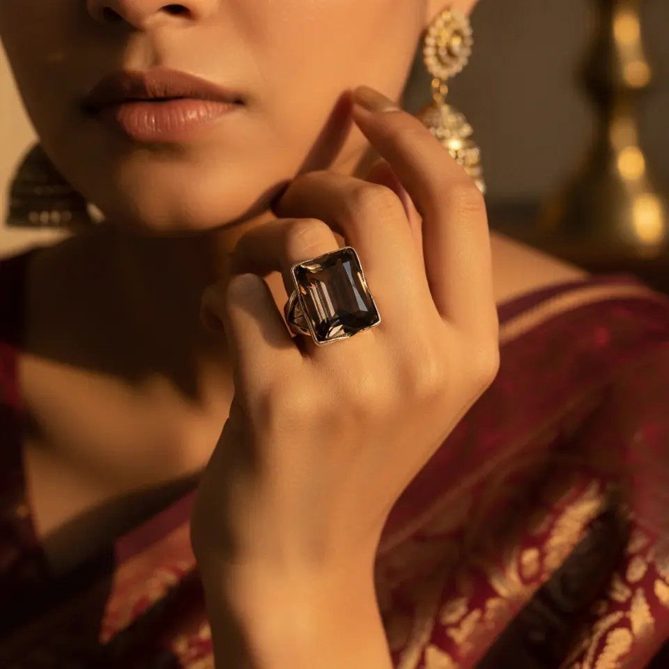 Women's Handmade Boho Statement Ring 925 Silver with Smoky Quartz Square Topaz Stone Platinum Cut Gift Jewelry