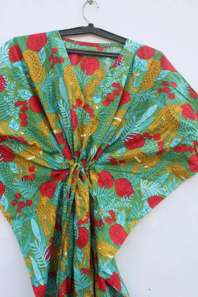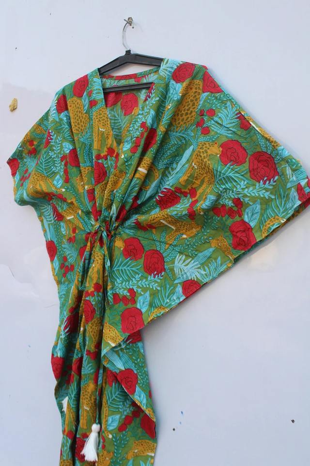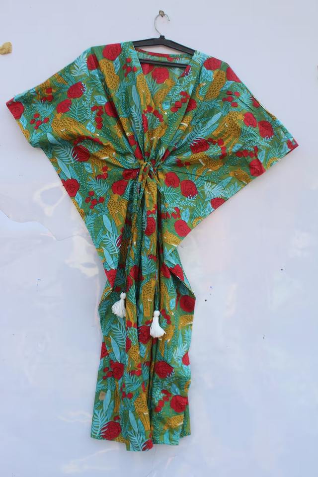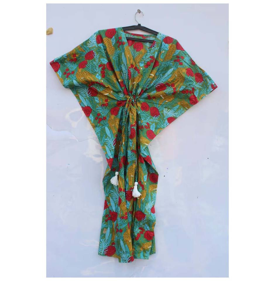 Women's Handmade Cotton Kaftan Dress Indian Style Hand Block Print Summer Night Wear with Feather Decoration Casual Dresses