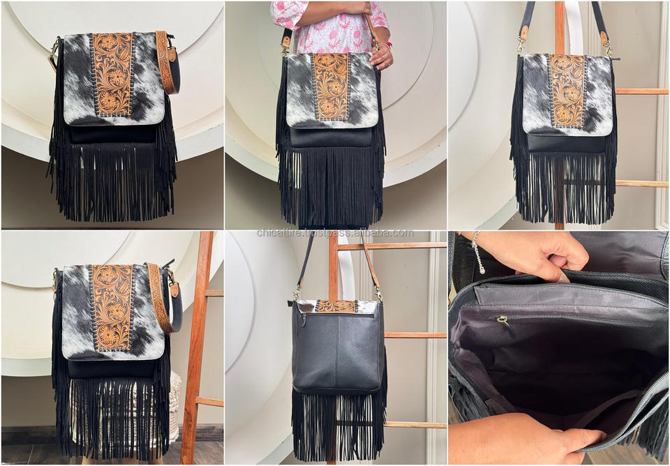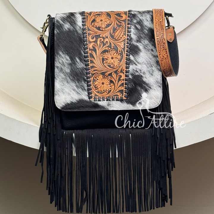 Product name:Hand Tooled Cowhide Leather Fringe Crossbody Bag