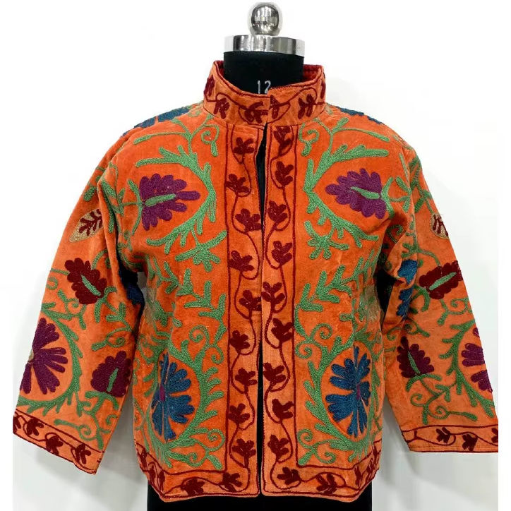 Women's Handmade Short Unisex Jacket Boho Velvet Suzani Floral Embroidery Cotton Fabric Breathable Knitted Coat for Winter