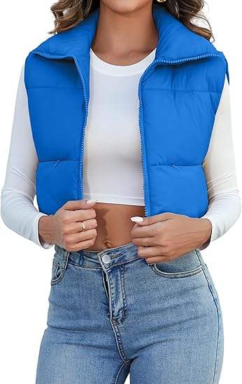 Women's High Neck Zipper Cropped Puffer Vest Jacket Coat Fashionable Short Length with Vintage Decoration