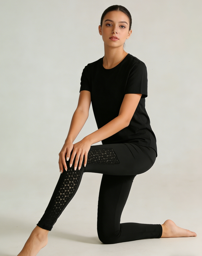 Women's High Waist Black Leggings with Floral Lace Side Panels - Stretchy Casual Pants for Daily Wear