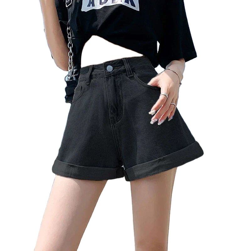 Women's High Waist Blue Cotton Denim Shorts Sporty Mini Fashion Wide-leg Short Pants Elastic Waist Breathable Design