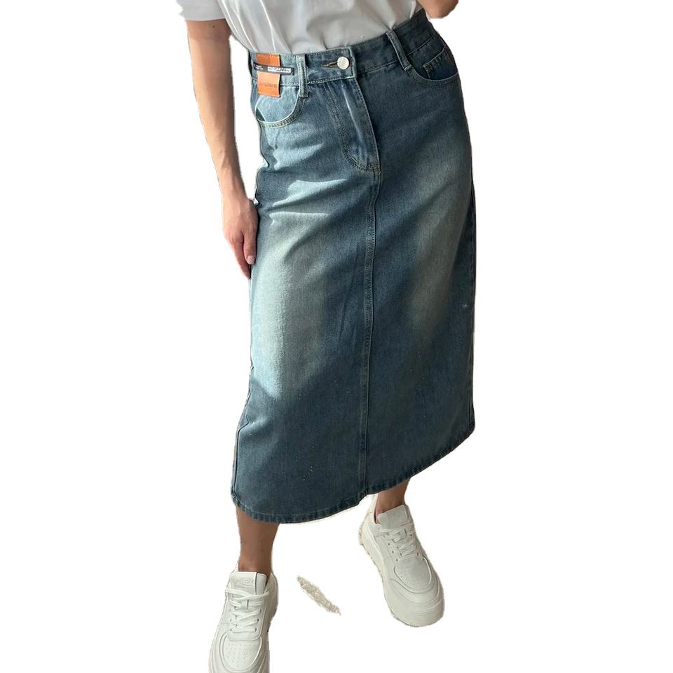 Women's High Waist Cotton Jeans Vintage Blue Straight Denim Skirt Solid Pattern Casual Style with Long Slit Bodycon Maxi Skirt