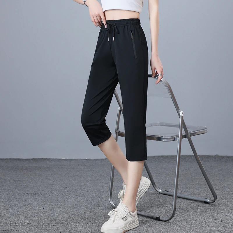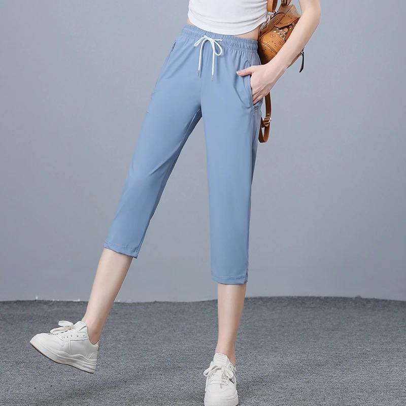 Women's Ice Silk Cotton Casual Cropped Trousers Summer Thin Capris Knee Length Straight Monochromatic cargo pants women