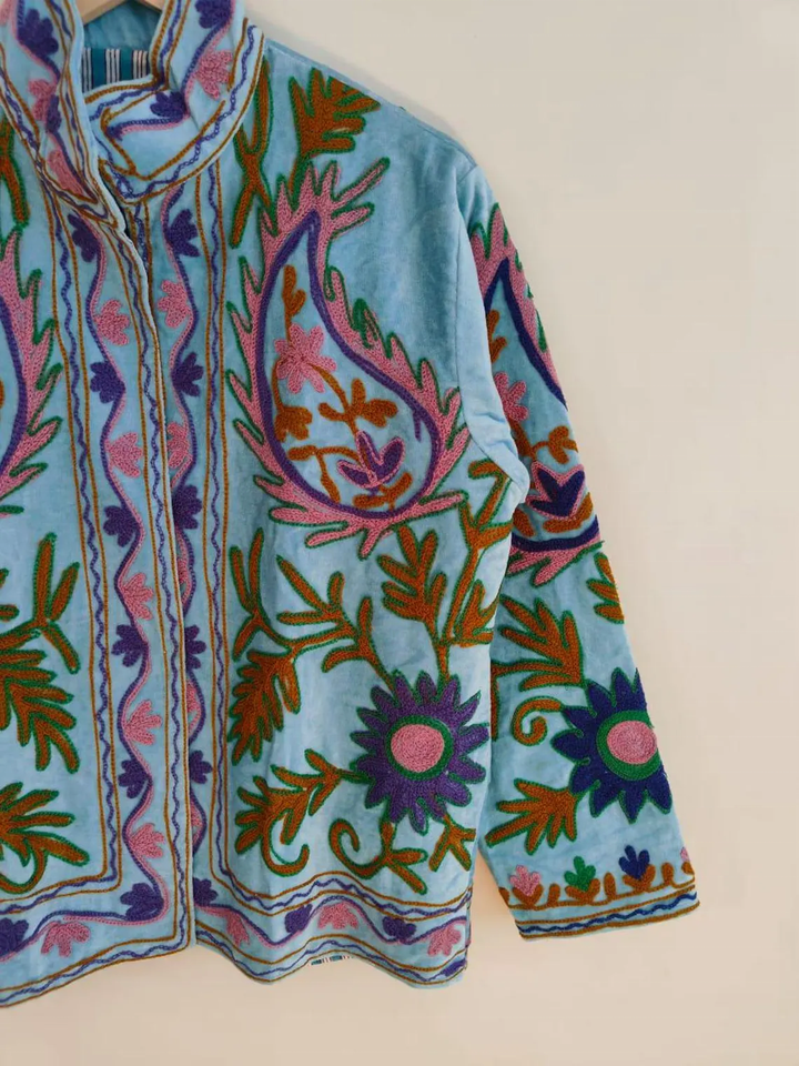 Women's Indian Velvet Suzani Embroidery Jacket Winter Warmed Quilted Coat with Floral Pattern Cotton Filling Material