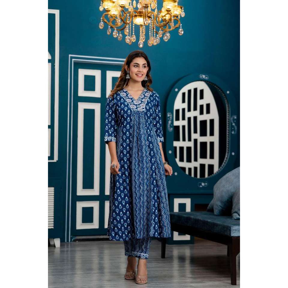Women's Indigo Blue Anarkali Kurta with Trousers & Dupatta Ethnic Motifs Printed Indian Festival Wear Salwar Kameez for Girls