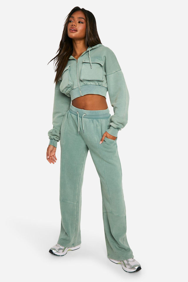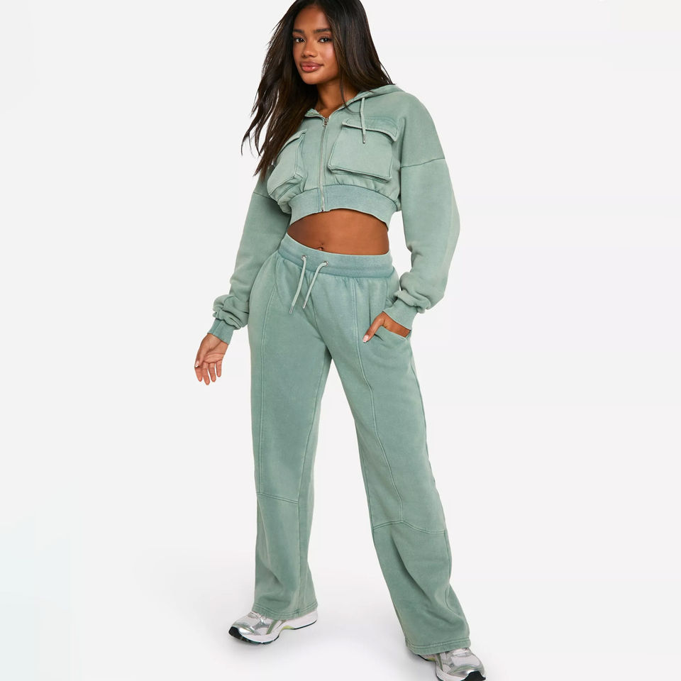 Women's Khaki Cargo Pocket Boxy Crop Hooded Tracksuit Set Breathable Hoodie Sweatpants New Gym & Sportswear Jogger Set