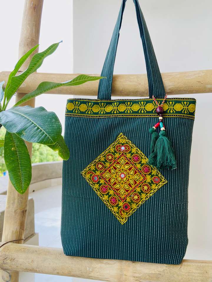 Women's Large Capacity Casual Vintage Bohemian Cotton Tote Lightweight Zip Closure Intricate Ajrakh Embroidery Handmade Soft Bag