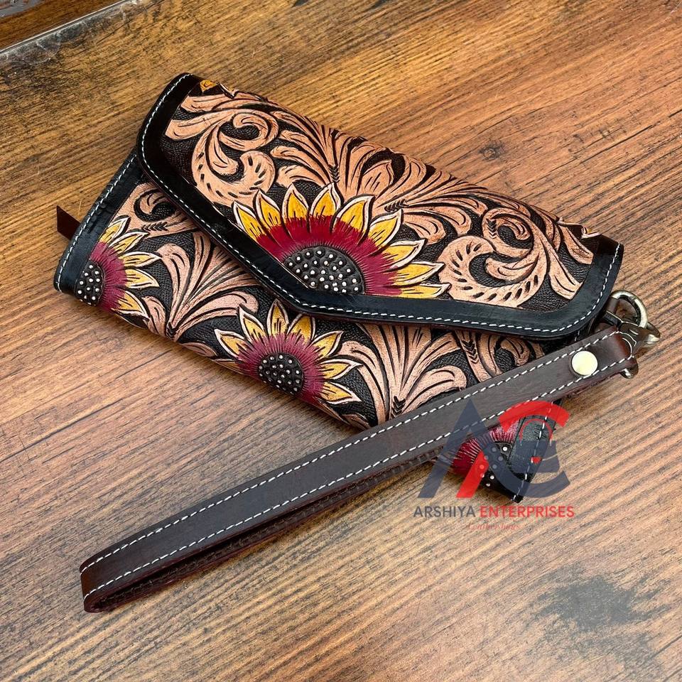 Women's Large Capacity Wallet Hand Tooled Leather Sunflower Design Ladies Multipurpose Clutch Genuine Leather Wristlet Wallets