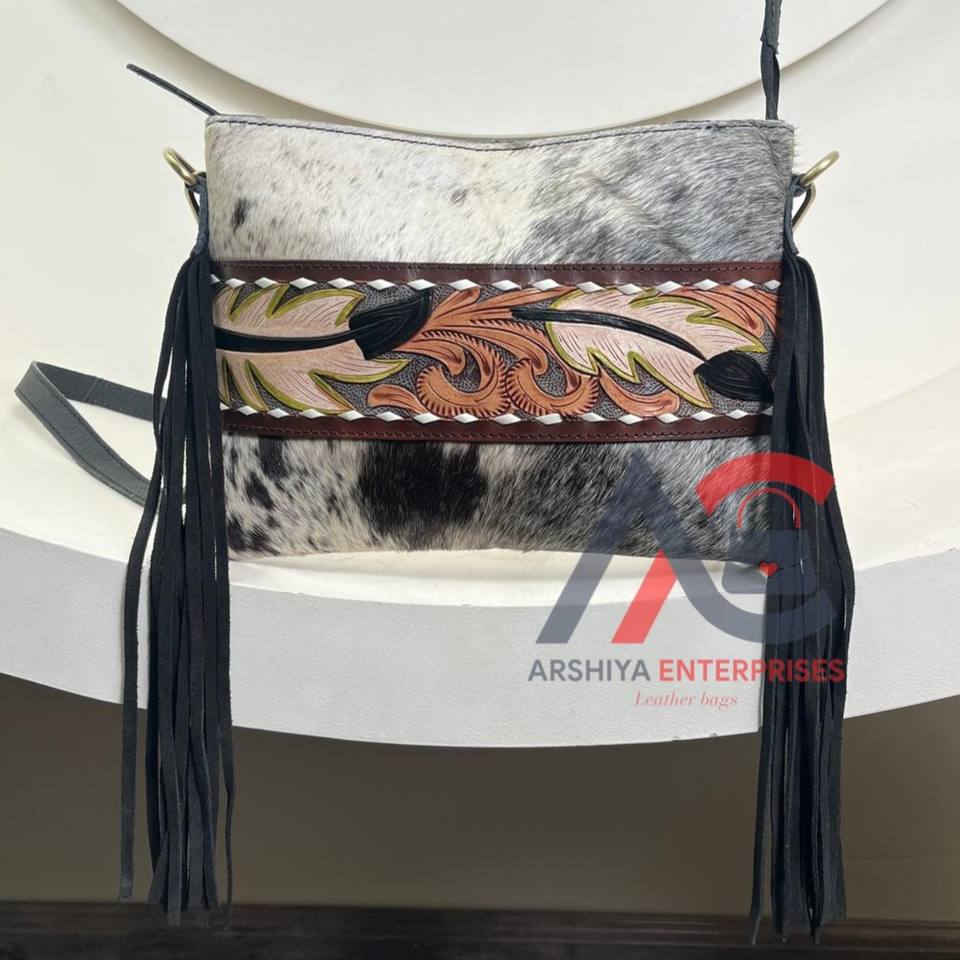 Hand Tooled Cowhide Leather Fringe Crossbody Bag