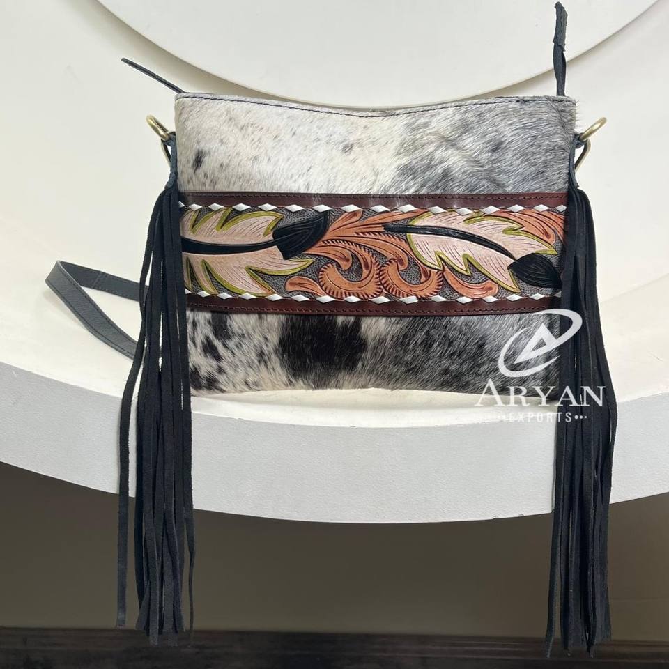 Hand Tooled Cowhide Leather Fringe Crossbody Bag