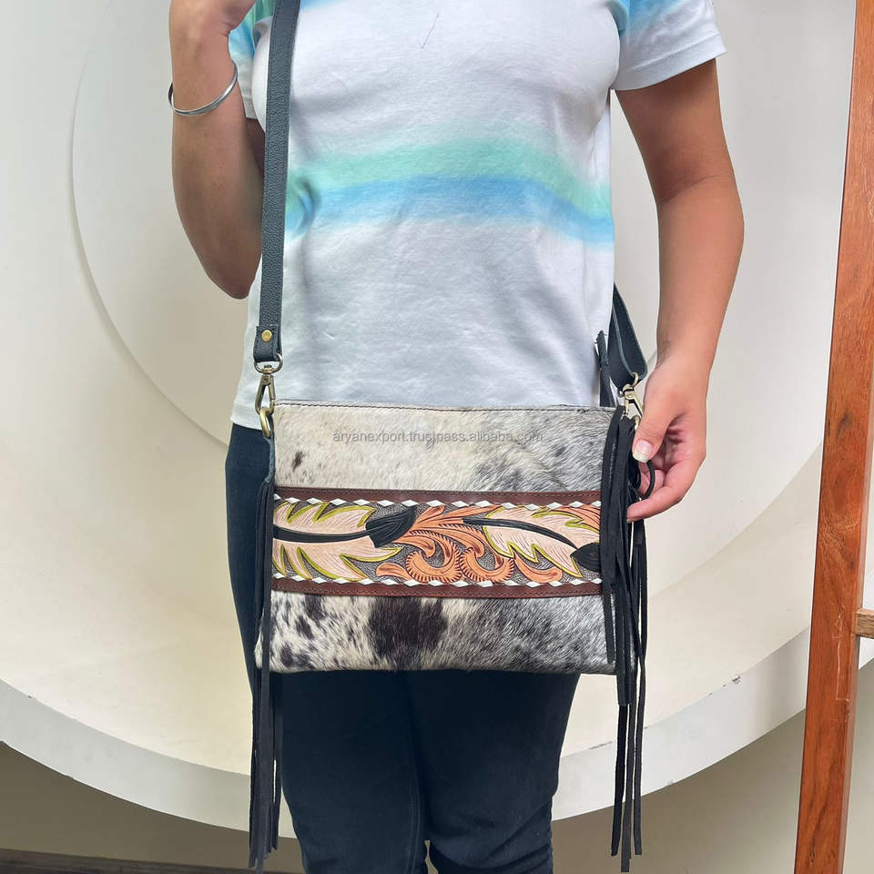 Women's Large Crossbody Handbag With Boho Hair High Quality Popular Hand Tooled Cowhide Leather Fringe Shoulder Bag for Women's