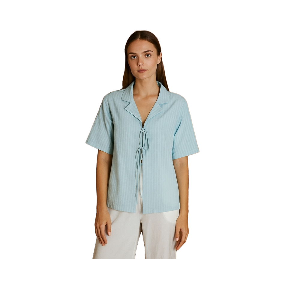 Women's Light Blue Cotton Tie-Up Short Sleeve Summer Blouse High Waist Front Bow Striped Texture Casual Wear with Lapel Collar