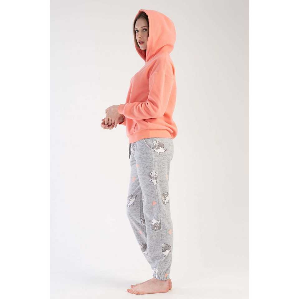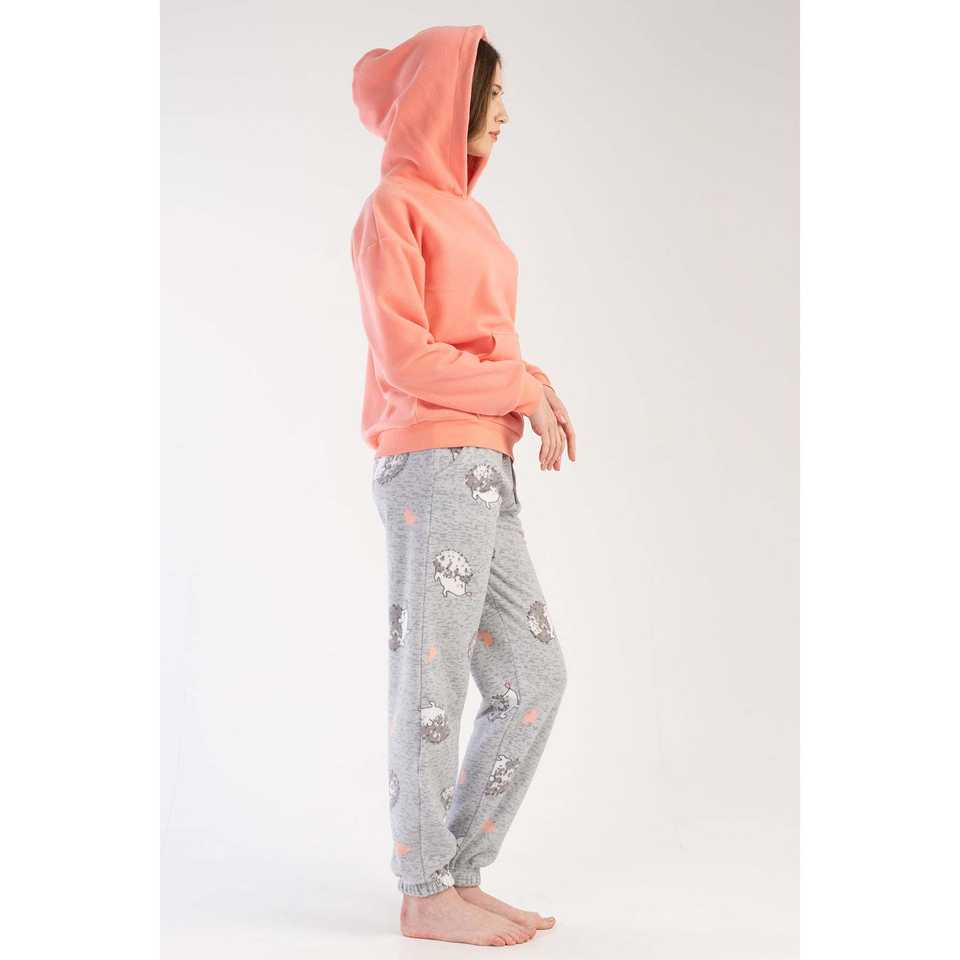 Women's Long-Sleeve Fleece Pajama Set Hooded with Dropped-Shoulder Kangaroo Pockets Cuffs Gathered Hem