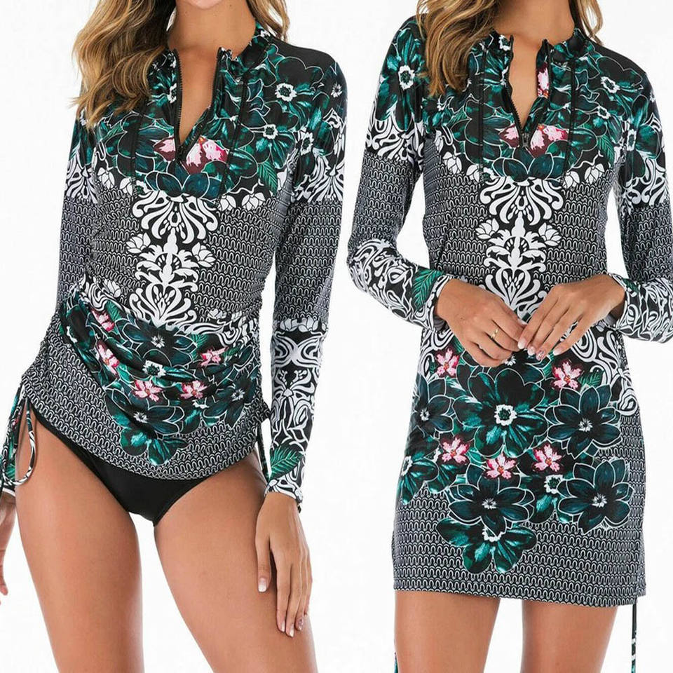 Women's Long Sleeve Floral Swim Top Zip Front UV Protection Swimsuit for Beach, Surfing & Swimming