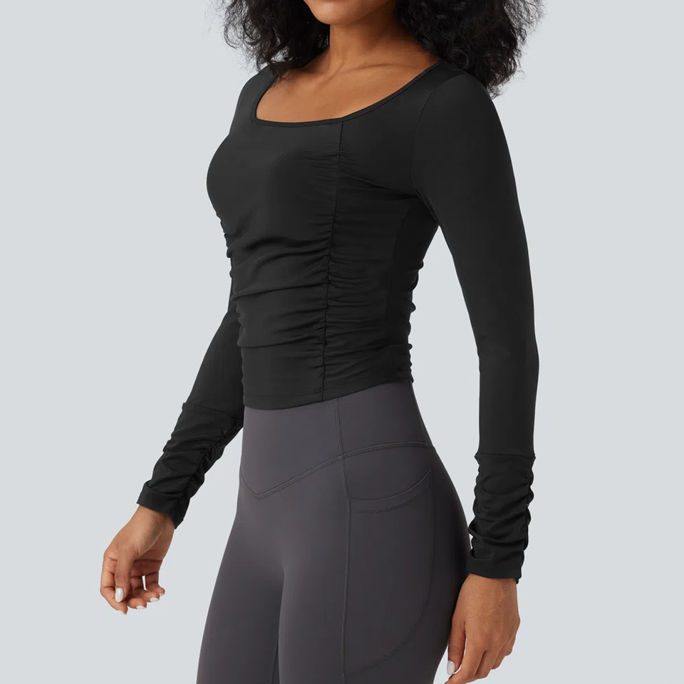 Women's Long-Sleeved Yoga Top Breathable Sportswear with Exposed Waist Nude Fitness T-Shirt with Bra Pads Plus Size
