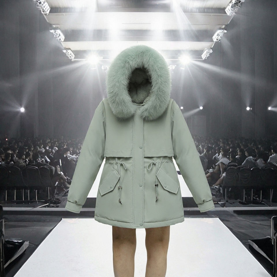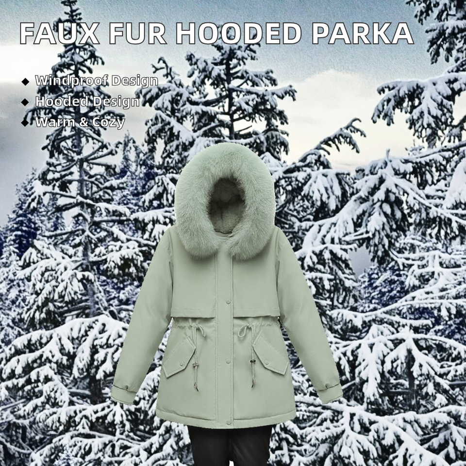 Women's Long Winter Parka with Faux Fur Hood Solid Color Windproof Zipper Closure & Button Decoration Plus Size Coat