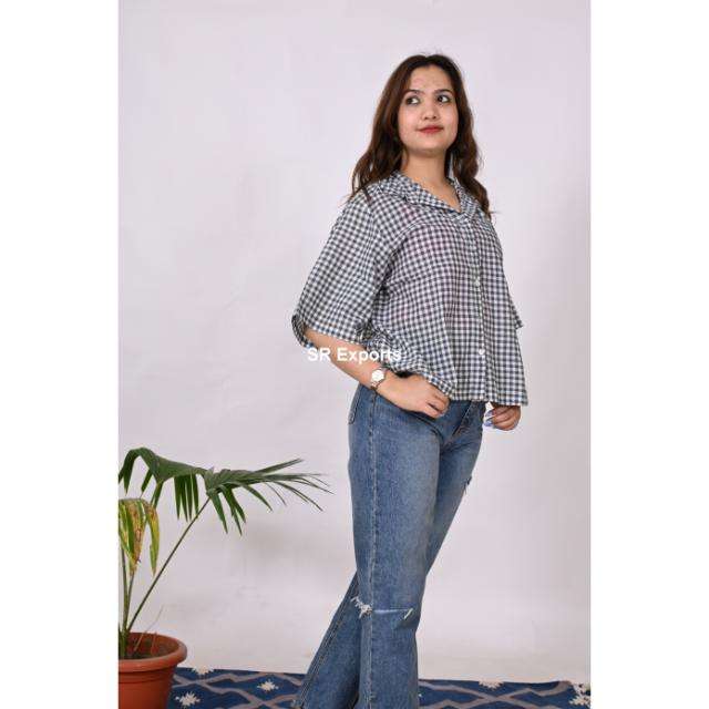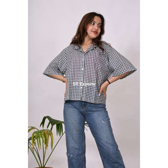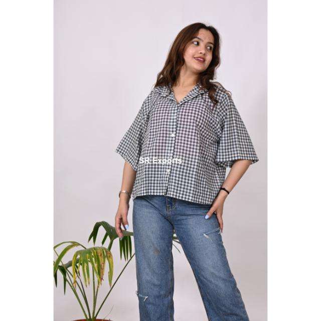Women's Loose Fit Cotton Black Checks Linen Stripe Print Shirt Handloom Woven Business Casual Style Formal Wear Blouse Shirts