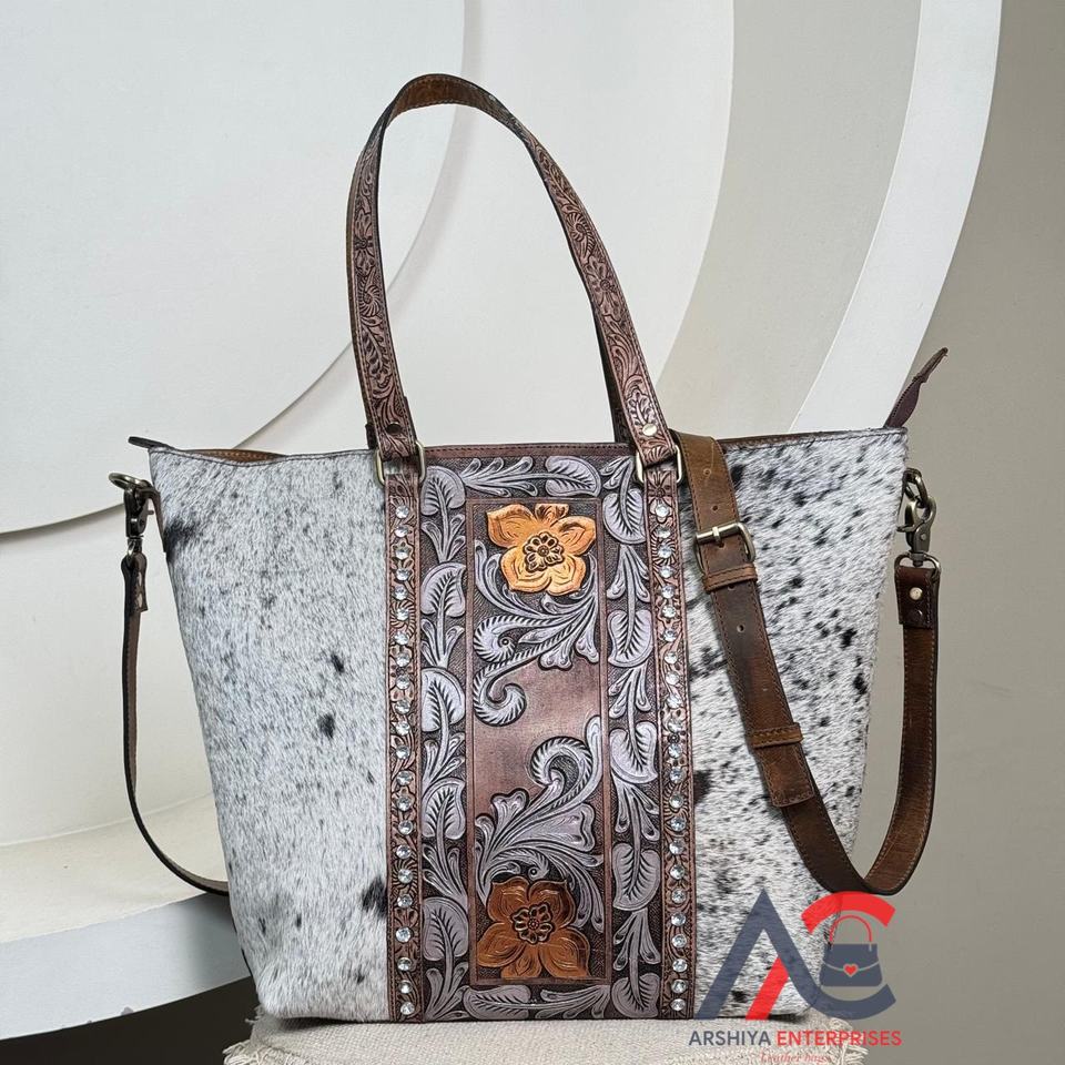 Product name:Hand Tooled Cowhide Leather Diamond Studs Tote Bag
