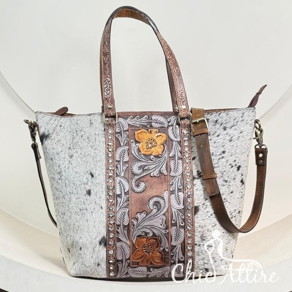 Hand Tooled Cowhide Leather Diamond Studs Tote Bag