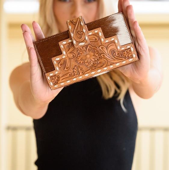 Women's National Style Hand-Tooled Wallet Natural Hair-On Other Trifold with Snap Closure RFID Fashion Vintage