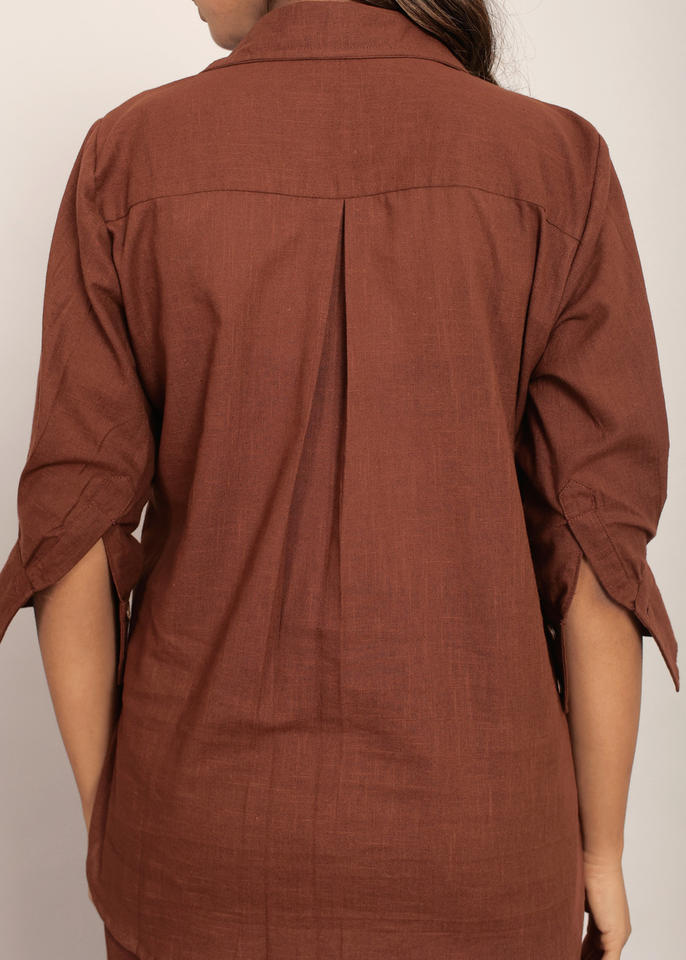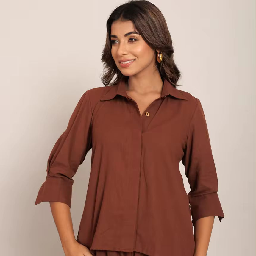 Product Name:Brown Solid Relaxed Shirt with Collar and Closer Buttons