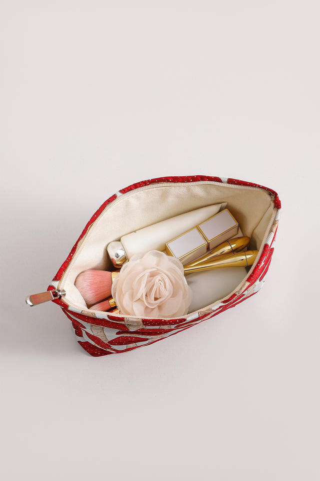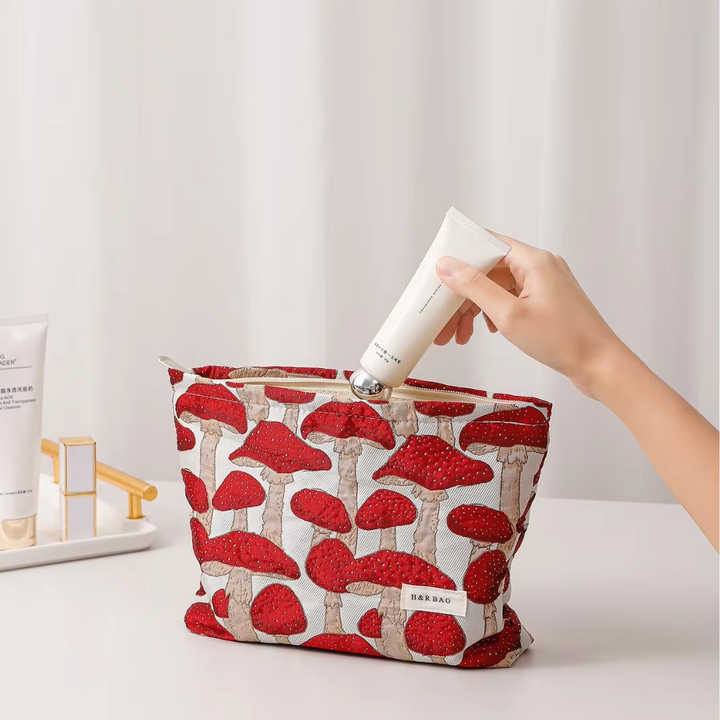 Women's New Mushroom Jacquard Fabric Makeup Bag Zipper Square Handbag with Leather Key Chains for Toilet Storage