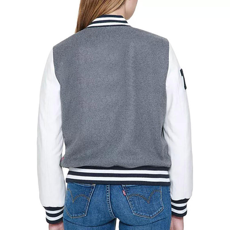 Women's New Street Style Varsity Jacket Solid Pattern Stand Collar Breathable Woolen Fabric with Cow Skin Leather Sleeves