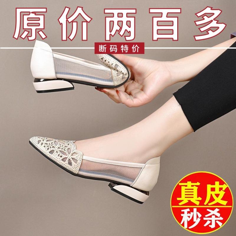 Women's New Summer One-Piece Mesh Heeled Sandals Closed-Toe with Pointed Toe & Hollow Rhinestones Low-Heel Mother's Shoes