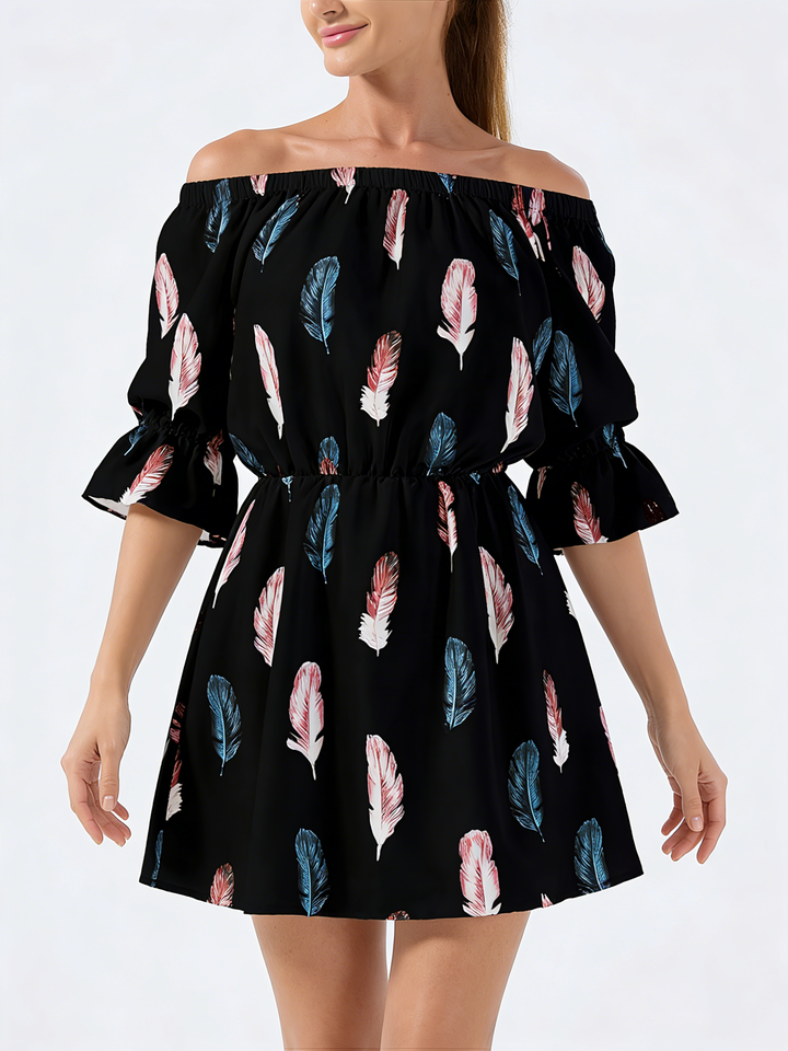 Women's Off-the-Shoulder Feather Print Everyday Midi A-Line Dress Flare Sleeves Natural Waist Summer Daily Casual Wear