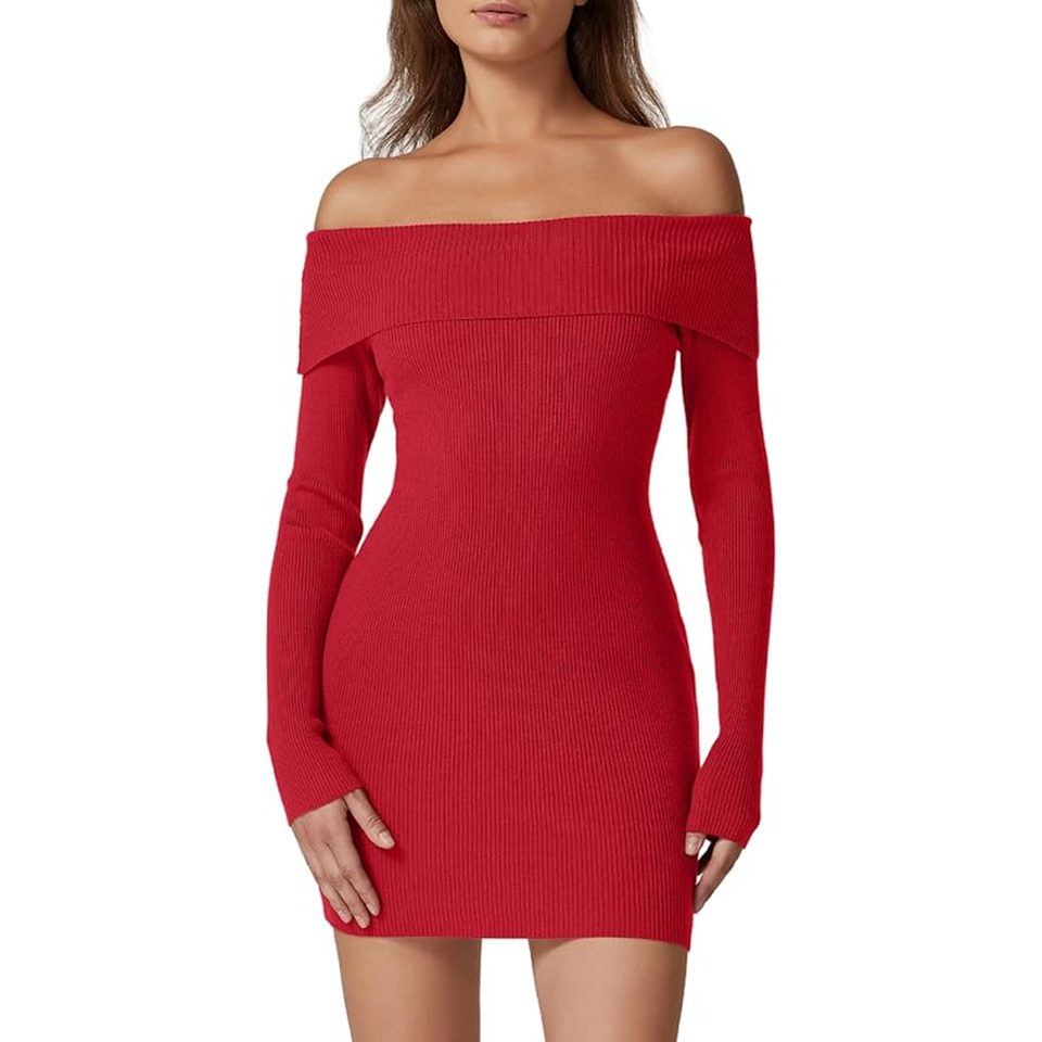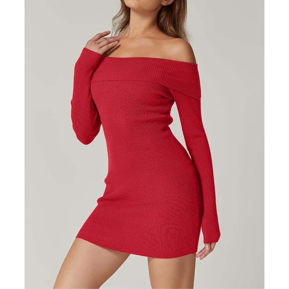 Women's Off the Shoulder Ribbed Knit Sweater Dress Folded Neck Long Sleeve Mini Dress 2025 Trendy Fall Outfits