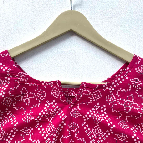 Women's Pink Bandhej Cotton Kurti Self-Design Printed Party Wear Short Top with Embroidery Hollow Out Tassel