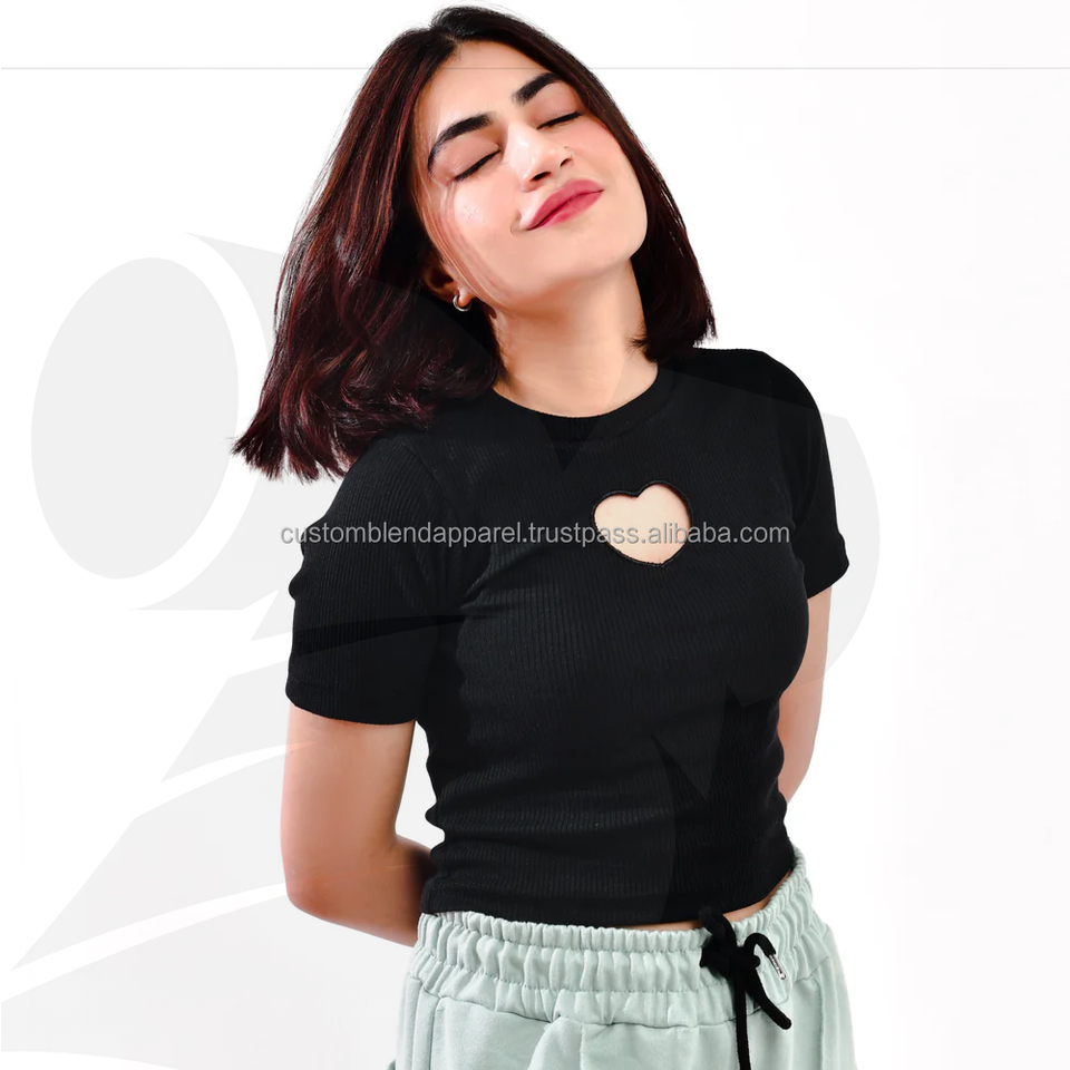 Women's Premium Quality Breathable Cotton Spandex Stretch Crop T-Shirts Heart Cut-Out Design Logo Vintage Formal Button