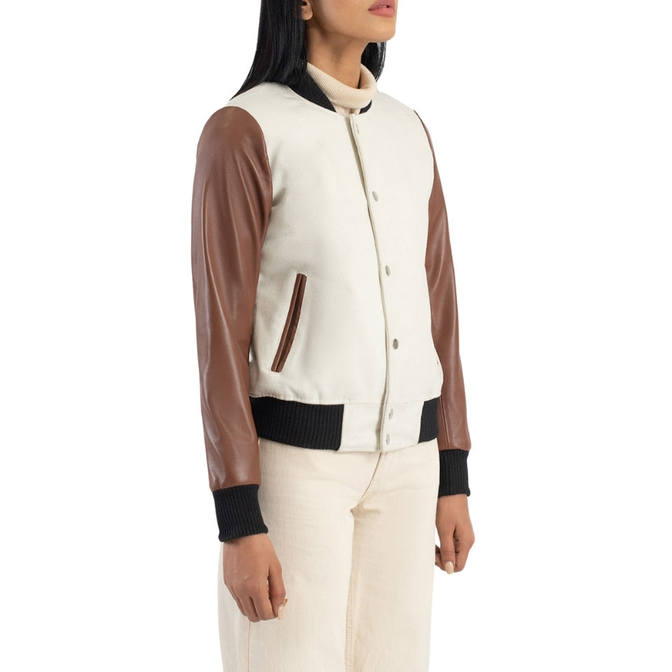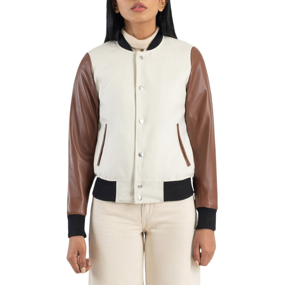 Women's Premium Quality Leather Wool Baseball Letterman Jacket Long Sleeve Varsity Jacket Stand Winter Wear New Pattern