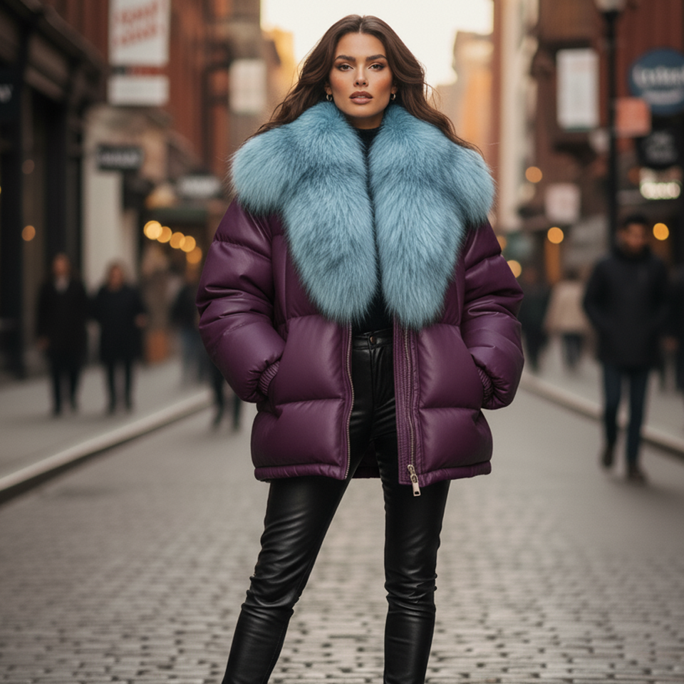Women's Genuine Leather Thin Puffer Jacket Fox Fur Collar Zipper Closure Winter Windproof Streetwear Fashion