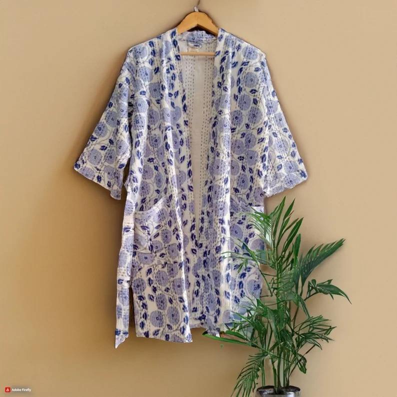 Women's Pure Cotton Floral Print Indian Kantha Robe Sleepwear Long Kimono Coat Vest Purple Bridesmaid's Nightgown for Summer