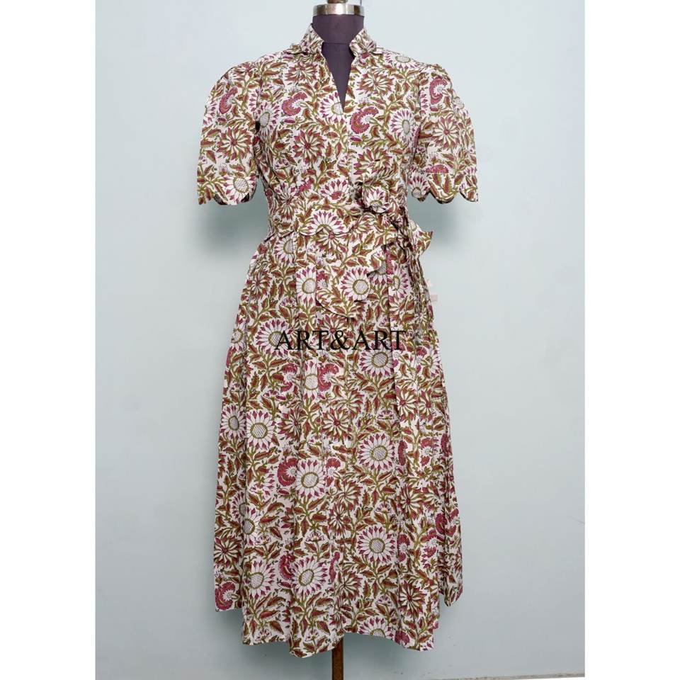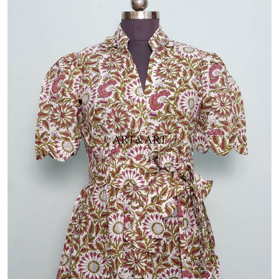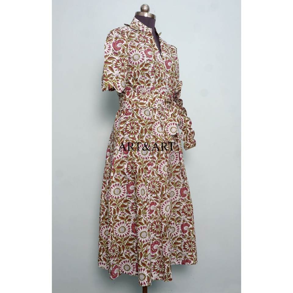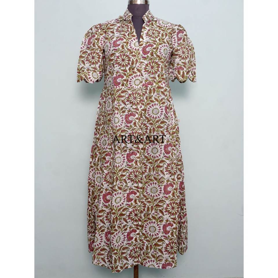 Women's Pure Cotton Kangura Midi Dress Hand Block Floral Printed Cute Daily Style Casual Party Wear Solid Sweet Style Natural