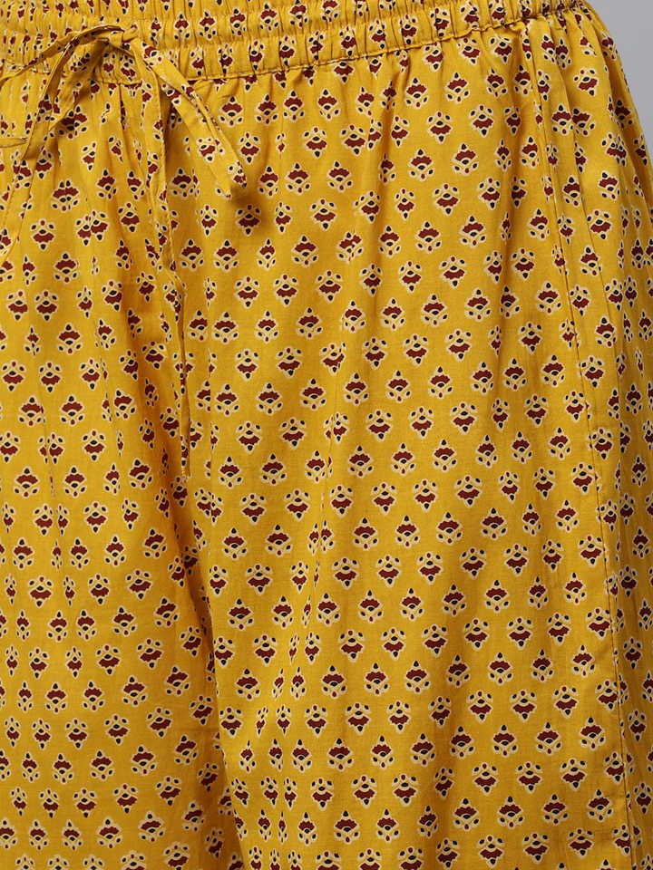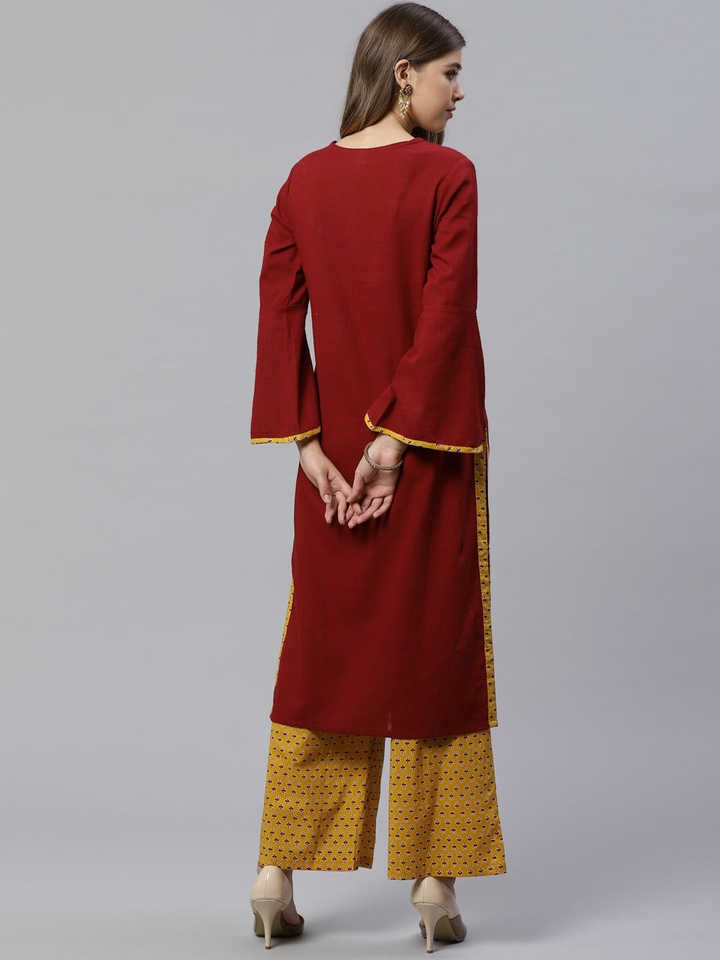 Women's Quick Dry Cotton Slub Solid Straight Ankle-Length Kurta with Ajarak Printed Palazzo Set Formal Summer Style (Maroon)