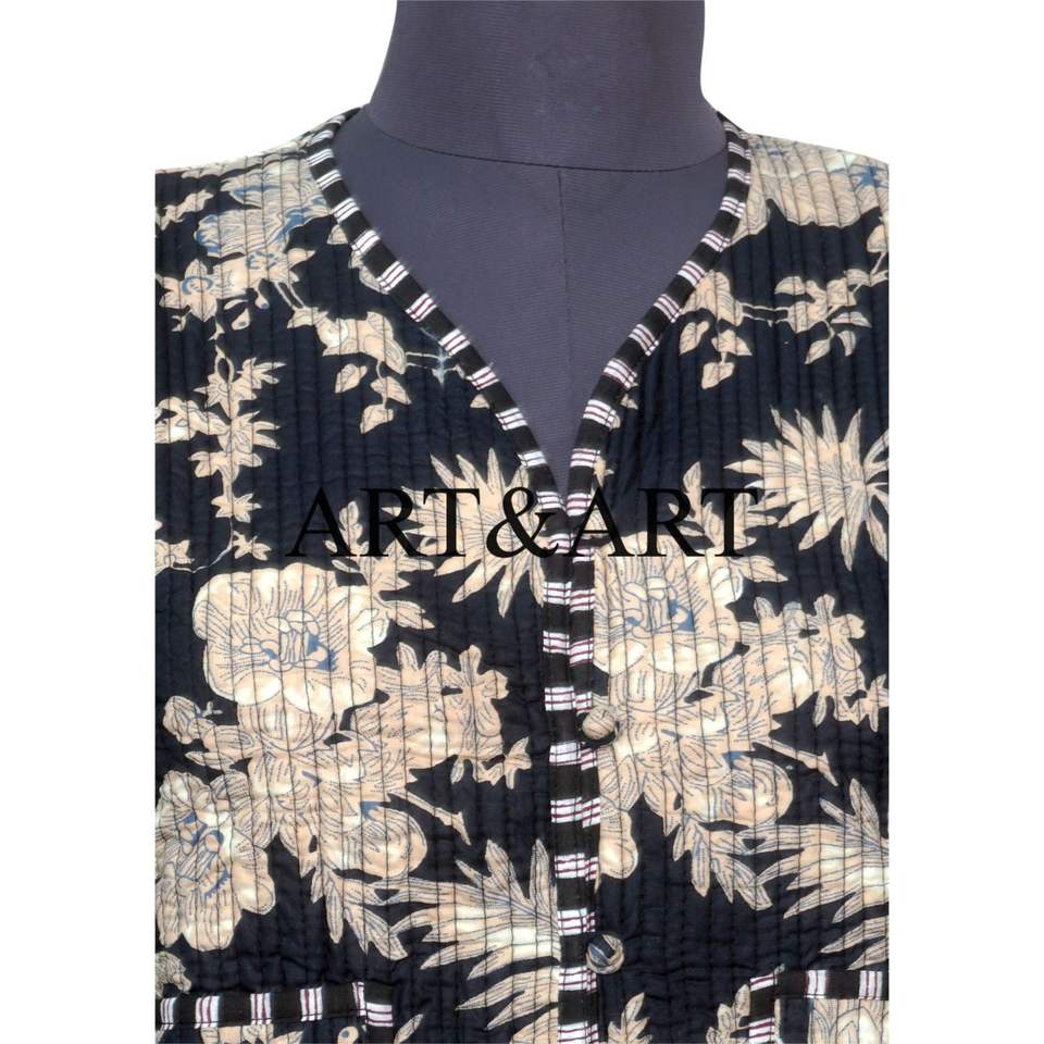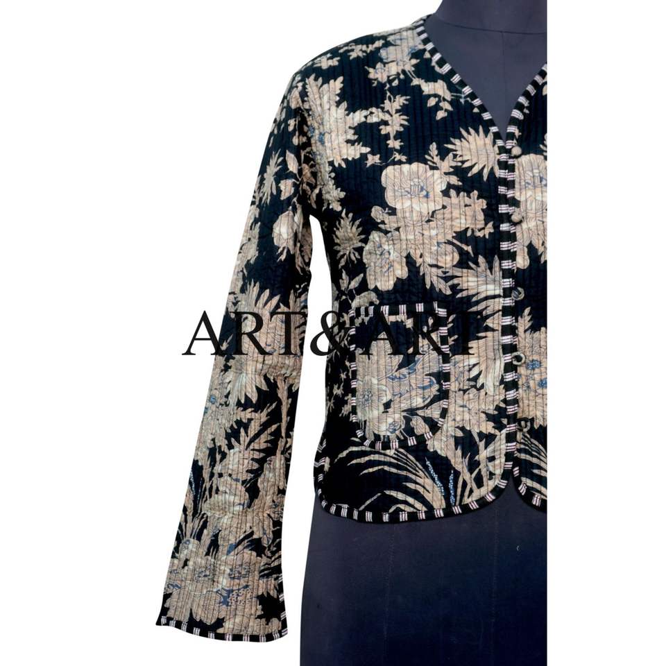 Women's Quilted Cotton Jacket with Hand Block Floral Print V-Neck and Stripe Decoration Trendy Winter Party Wear