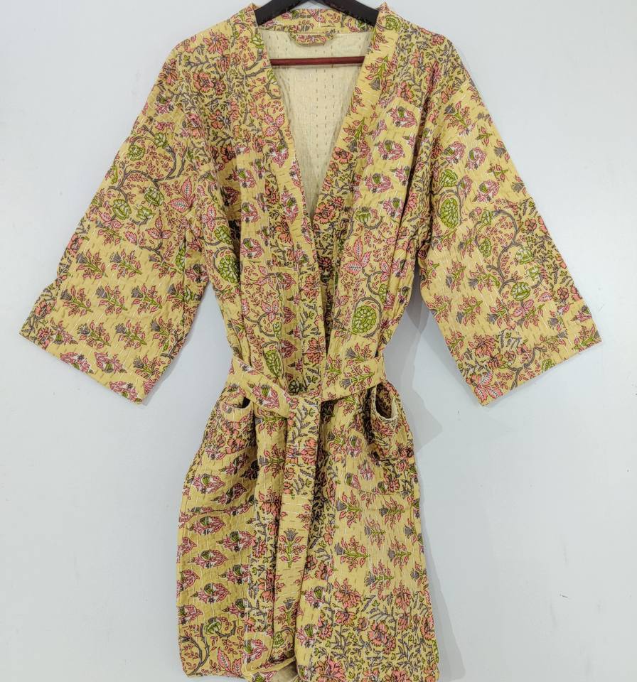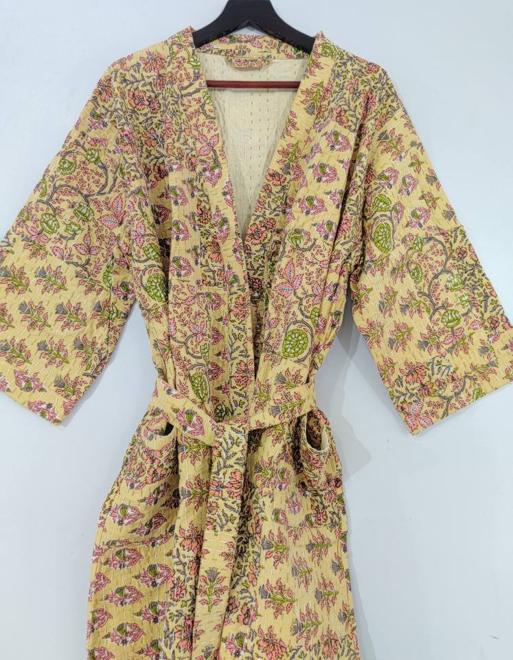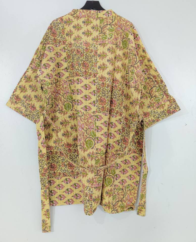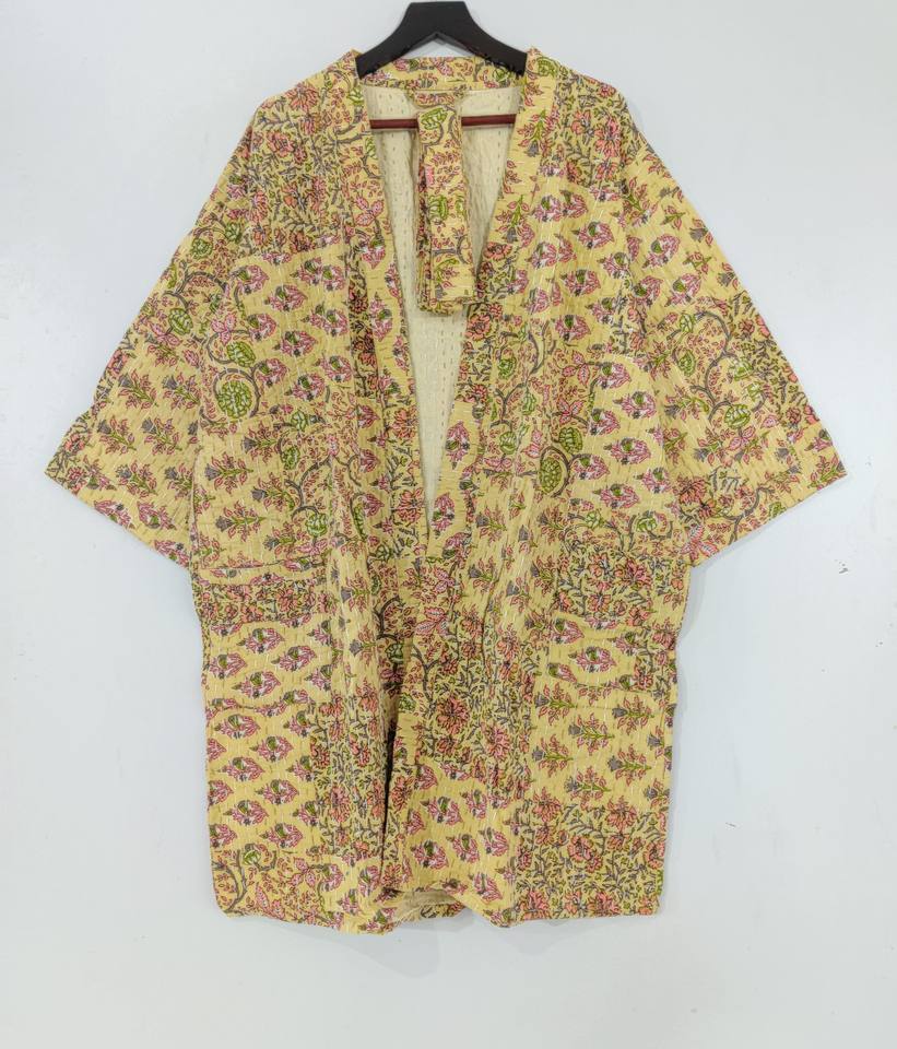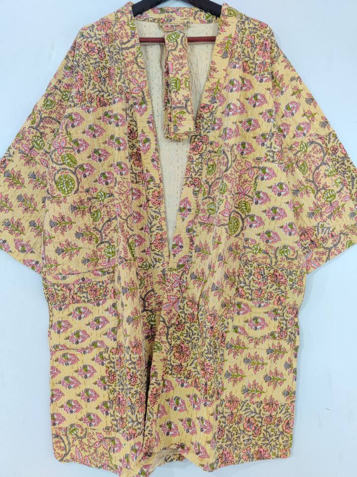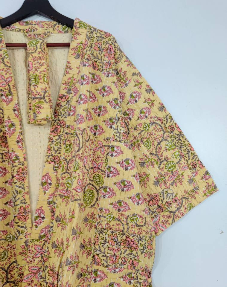 Women's Quirky Kantha Quilt Embellished Handmade Indian Embroidery Boho Floral Printed Cotton Long Coat Free Edge Winter Knitted