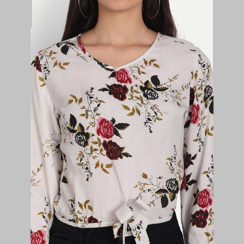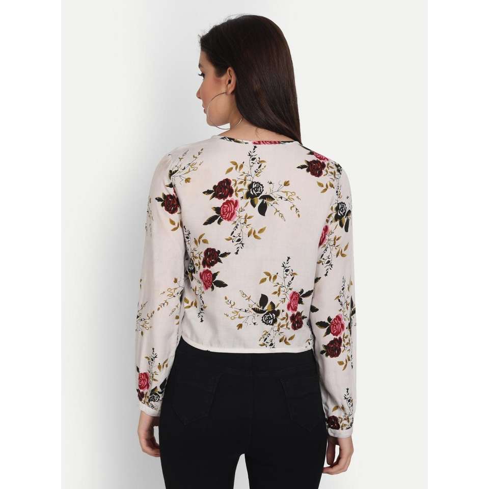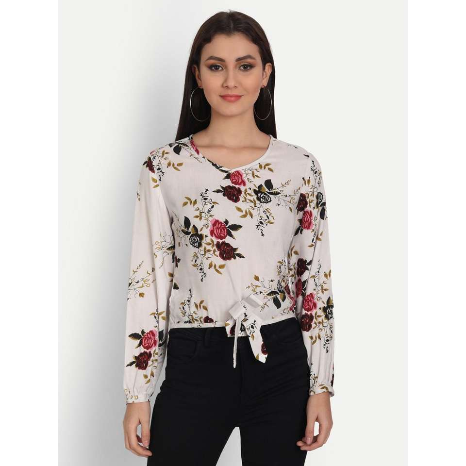 Women's Rayon White Floral Printed Chiffon Top Full Sleeve Ruffled Collar Vintage Retro Style for Office Autumn Spring Season XS