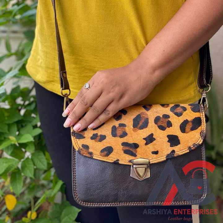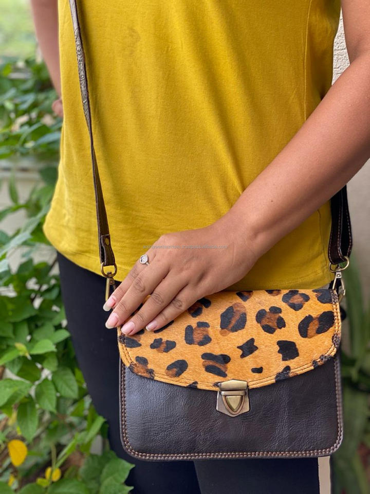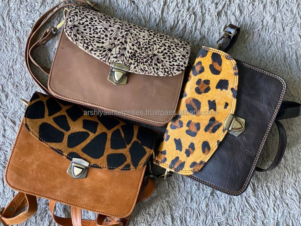Women's Recycled Colored Leather Bag with Hair Animal Print Handmade Western Crossbody Purse Ethnic Shoulder Bag