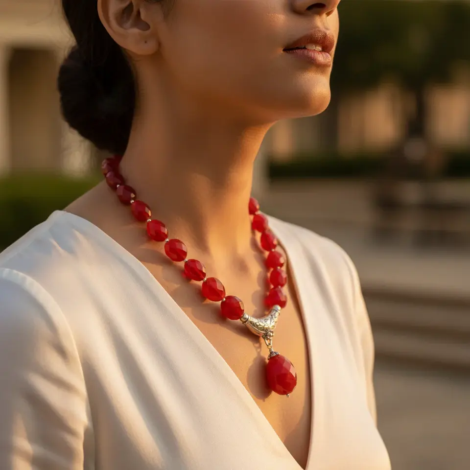 Women's Red Carnelian Bead Silver Pendant Classic Trendy Religious Hook Number Shape Pattern Agate Brass Chains for Gifts