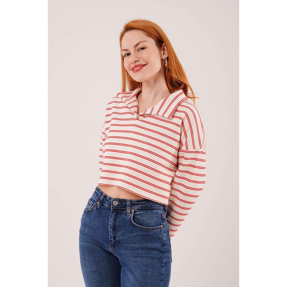 Women's Red Striped for Polo Collar Crop Sweatshirt Wholesale Hoodies & Sweatshirts