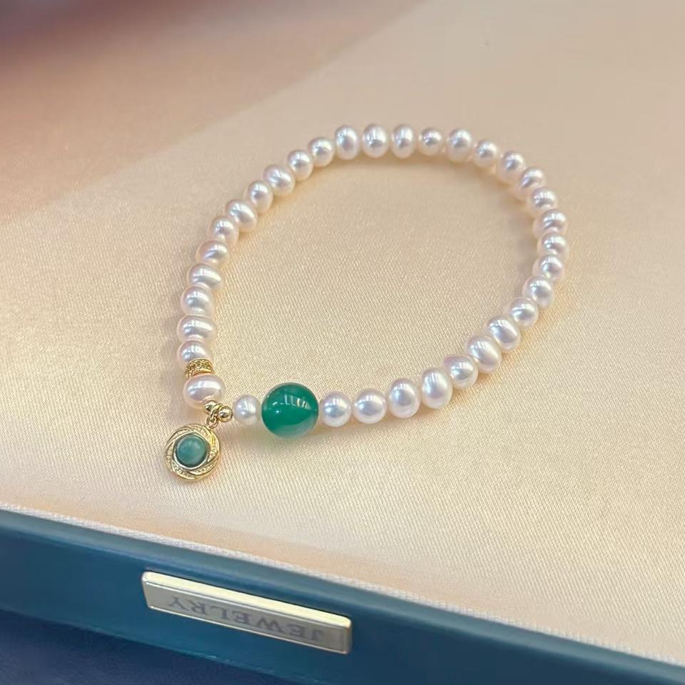 Women's Retro Bracelet Red Green Agate Freshwater Pearl with 6-7mm Rice Beads Adjustable Charm Bracelet for Spring