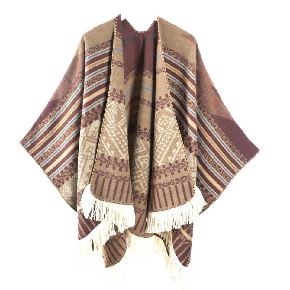 Women's Retro Ethnic Argyle Reversible Lightweight Large Tassel Outer Match Cloak Robe Travel Split Shawl New