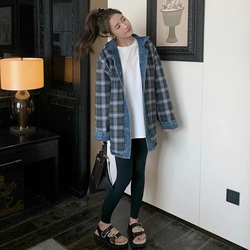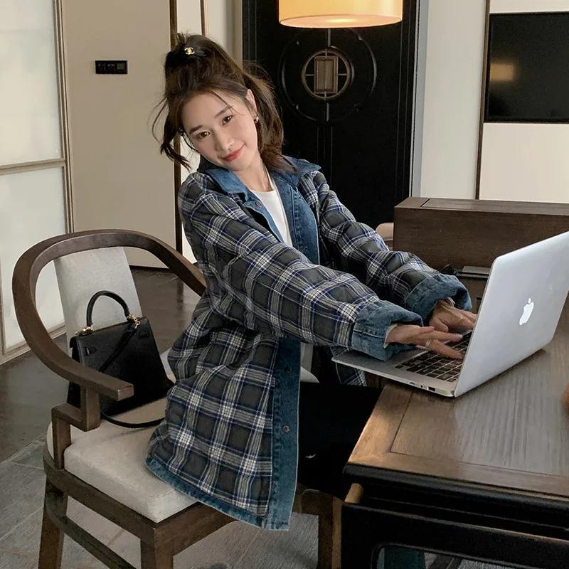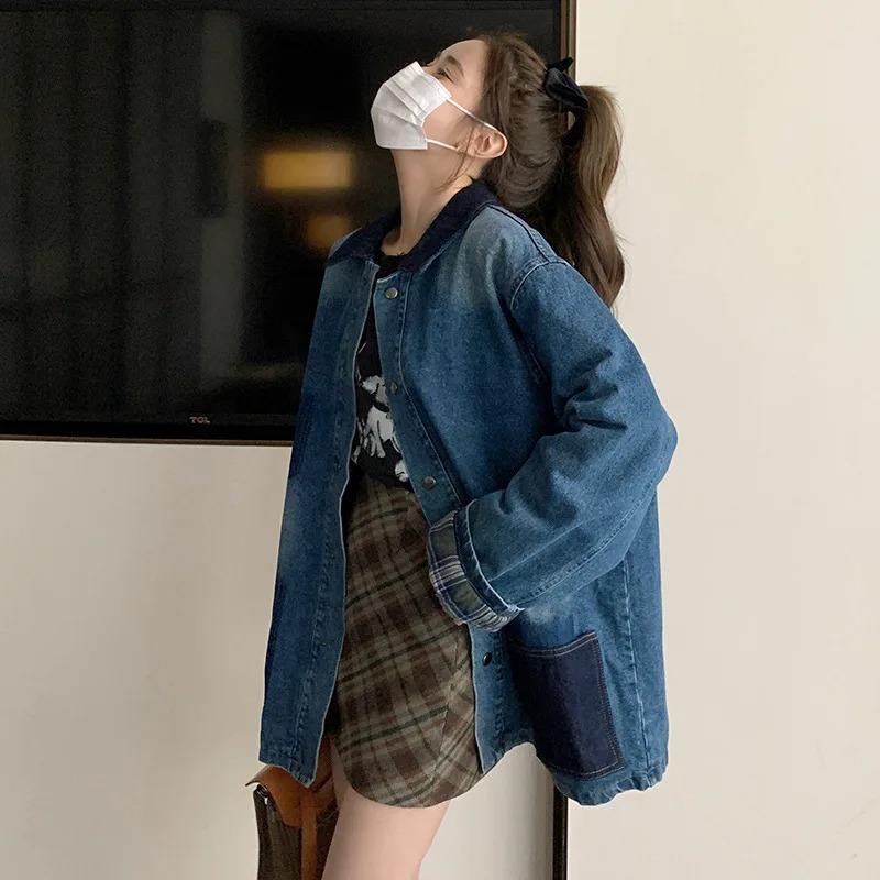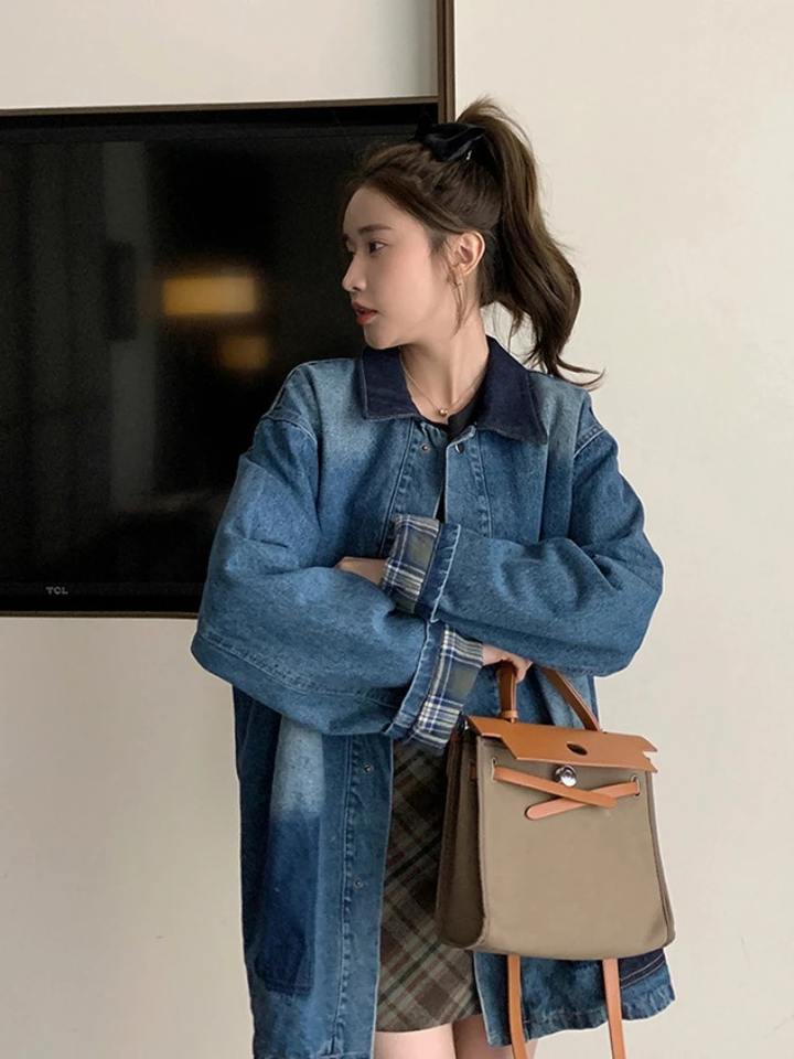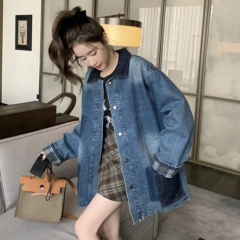 Women's Retro Korean Reversible Denim Jacket Plaid Splicing with Loose Washed Tops for Spring Fall Fashionable Jean Coat for Men