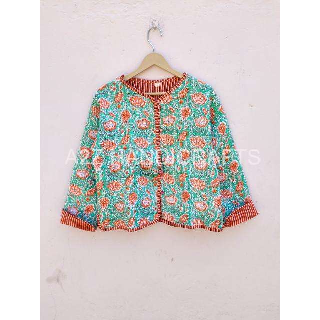 Women's Reversible Floral Block Printed Quilt Jacket Handmade Vintage Kantha Quilt Cotton Filling Short Length Jaipur Inspired