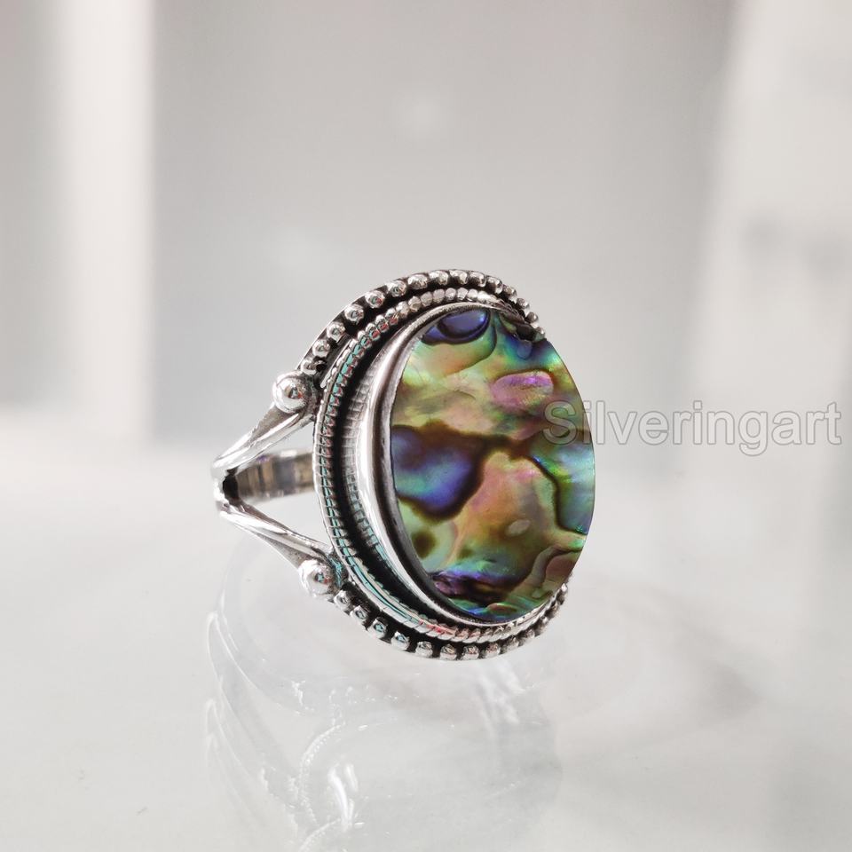 Women's Ring Natural Abalone Shell Gemstone Ring Birthstone Bohemian Band Eastern Handmade Jewelry 925 Sterling Silver Ring